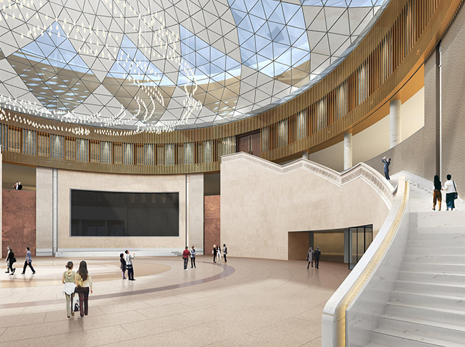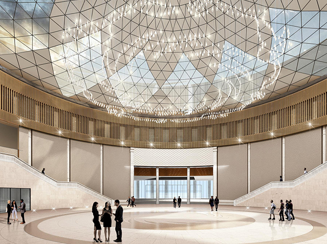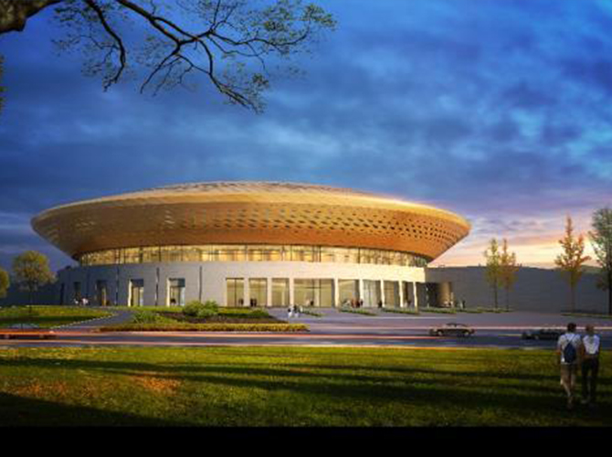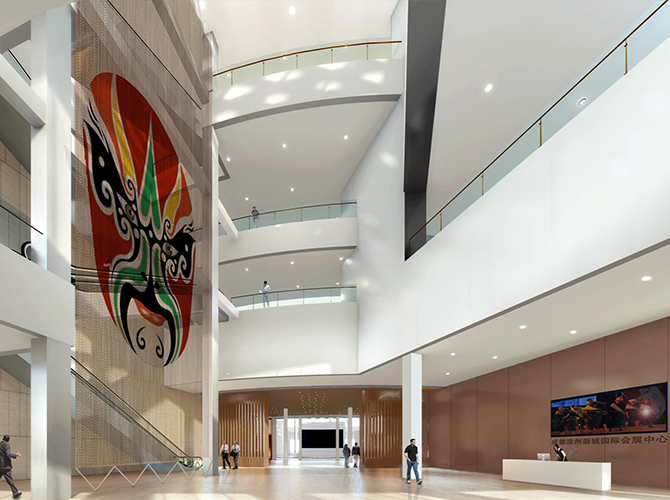 淮州新城國(guó)際會(huì)展中心采用圓形作為基本形體,通過(guò)透明玻璃幕墻從底部托起,營(yíng)造出建筑整體懸浮半空的姿態(tài),形似“UFO”飛行器。主要分為展覽中心、會(huì)議中心、航空博物館和設(shè)備用房及庫(kù)房等輔助功能區(qū)三部分功能分區(qū)。一層為展廳,服務(wù)于未來(lái)航空產(chǎn)業(yè)產(chǎn)品的展覽,二三層為會(huì)議功能區(qū),服務(wù)于大型航空產(chǎn)業(yè)會(huì)議的召開,四層為航天博物館。未來(lái),淮州新城國(guó)際會(huì)展中心將成為淮州新城通用航空產(chǎn)業(yè)對(duì)外展示的窗口。