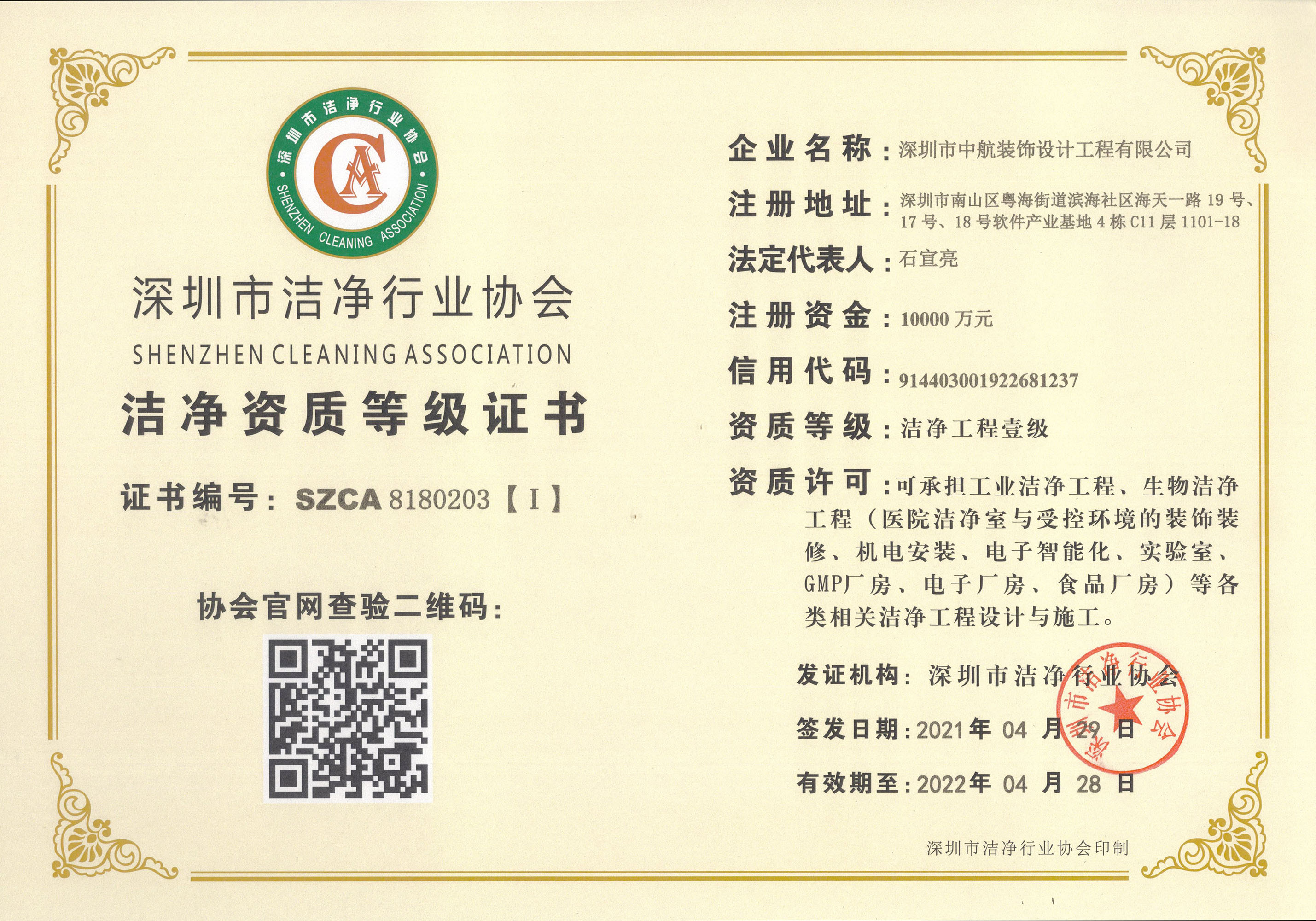 ? ? ? ?近日,中航裝飾集團喜獲深圳市潔凈行業(yè)協(xié)會頒發(fā)的潔凈工程壹級資質證書,并被授予協(xié)會副會長單位。