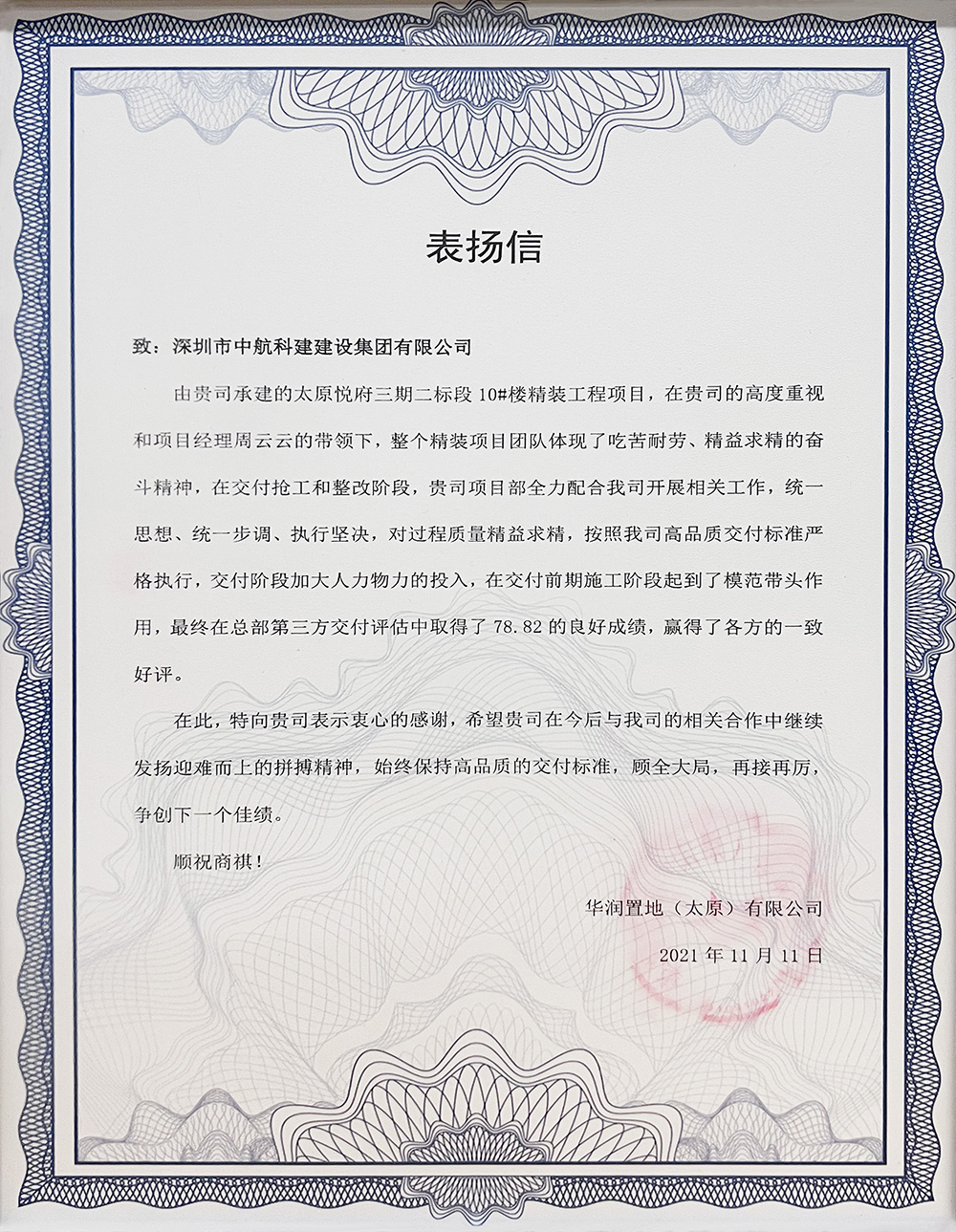 ? ? ? ?此次獲得業(yè)主方高度認可,讓我們倍感榮幸。甲方的表揚是最高榮譽,更是一種激勵,中航科建將繼續(xù)全力以赴在保證質量的同時大力推進工程創(chuàng)優(yōu),全面提升履約品質,進一步強化施工質量意識,提高施工管理水平,堅持不懈的為客戶提供更加優(yōu)質的服務,打造更多更好的優(yōu)質精品工程。
