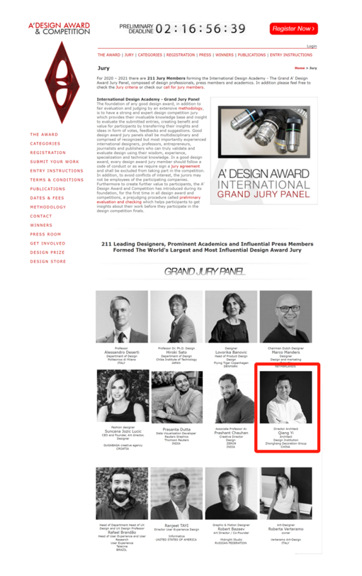 ? ? ? ?多年來他受邀擔任意大利A Design Award 設計大獎|國際評審、中國百強H.Design酒店設計大賽專家評審、中國建筑學會室內設計獎|專業評委、深圳市住建局政府特聘|專家評委、中國未來空間設計大賽尋星獎|專家評委、中國祝融獎總決賽|專業評委等多個設計大賽的專業評審,其中2019至2023年連續五年受邀意大利A設計獎擔任建筑與室內單元國際評委。