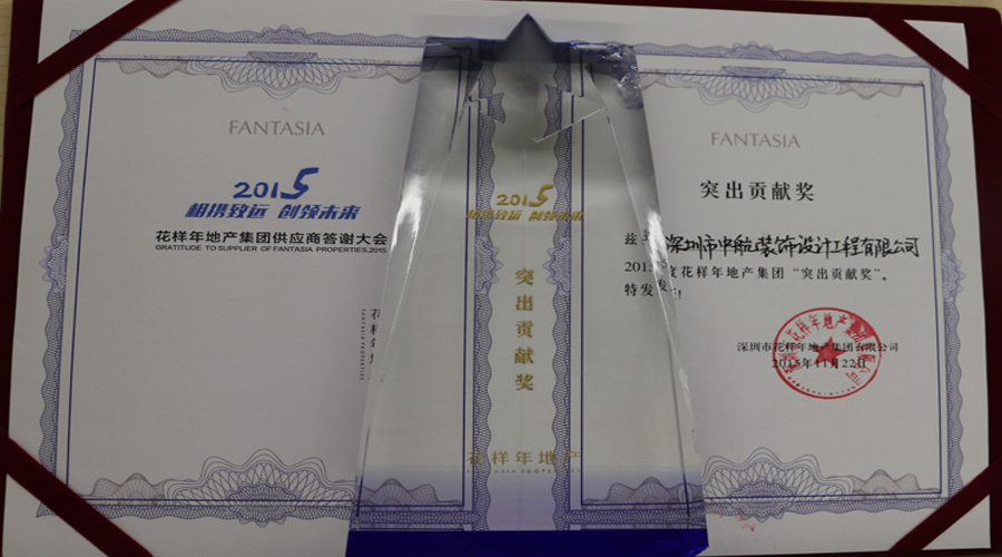 ? ? 11月22日,花樣年地產集團2015年“相攜致遠,創領未來”供應商答謝大會隆重舉行。花樣年地產集團的眾多合作單位與供應商代表齊赴盛會,共享成功喜悅!中航裝飾集團董事長石英、總經理孫玉東受邀出席大會,敘友情、話合作、謀發展,并一舉榮獲本次盛會最重要的獎項“花樣年地產集團2015年度突出貢獻獎”。